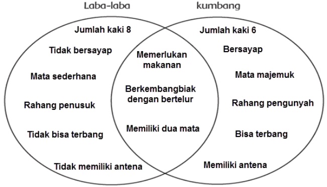 Lengkapi diagram berikut untuk menampilkan persamaan dan perbedaan antara laba-laba dan kumbang.